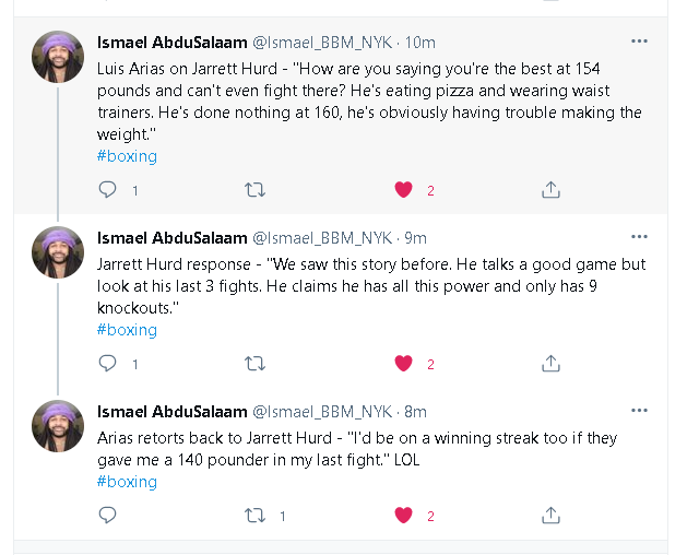 Former IBF/IBO/WBA 154-pound champ Jarrett Hurd (24-1, 16 KOs), of Accokeek, Maryland, and Luis Arias (18-2-1, 9 KOs), of Boca Raton, Florida, also will square off in a junior middleweight match on the Mayweather-Paul undercard.