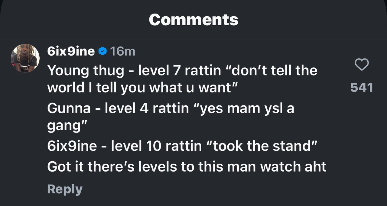 6ix9ine - level 10 rat. Young Thug - level 7 rat. Gunna - level 4 rat. Agree or nah?