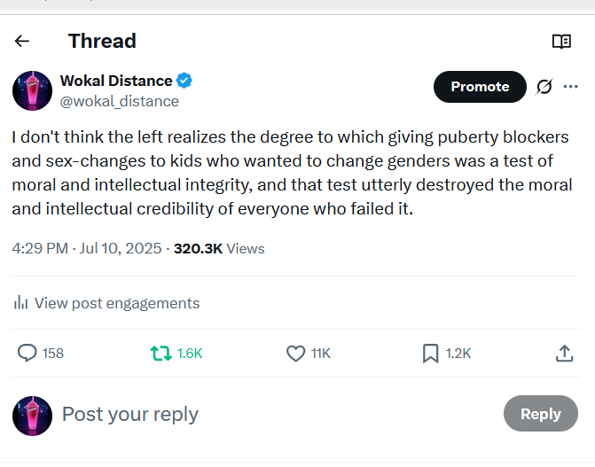 As I wrote on X/twitter last week: I don't think the left realizes the degree to which giving puberty blockers and sex-changes to kids who wanted to change genders was a test of moral and intellectual integrity, and that test utterly destroyed the moral and intellectual credibility of everyone who failed it. The left appears to have no understanding of the degree to which the adoption of gender ideology by social institutions destroyed the credibility and legitimacy of those institutions. To make matters even worse, the left appears to have no idea WHY the adoption of gender ideology was so corrosive to the credibility and legitimacy of the social institutions that adopted it.