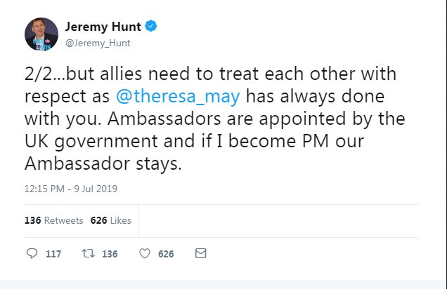JUST IN: British Foreign Sec. Hunt, who is running to succeed PM May as prime minister, responds to Pres. Trump: