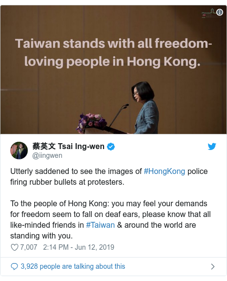 Taiwanese President Tsai Ing-wen tweeted that her nation supported the protesters' "demands for freedom".