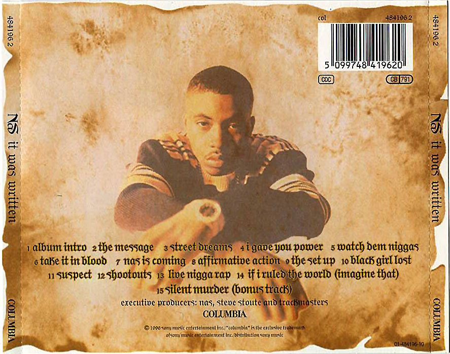 It Was Written. “Street Dreams,” the second single released from the album, may have been a blatant attempt at garnering radio and video airplay, but in hindsight, is far from criminal in sentiment and contains tons of insightful gems on the mindstate of young and ambitious black and brown men in urban America. From detailing his plans of wanting to wash his hands of the street life and go legit on the first verse, to reminiscing on his days as an impressionable pre-teen yearning for spoils of the criminal life with the couplet “Young early 80’s, throwing rocks at the crazy lady/Worshipping every word them rope-rocking nikkas gave me/The street raised me up giving a fukk/I thought Jordan’s and a gold chain was living it up.” The vibes of innocence and naivete are exchanged for conceptual exploits on the visceral offering, “I Gave You Power,” with Nas rapping from the perspective of a gun.