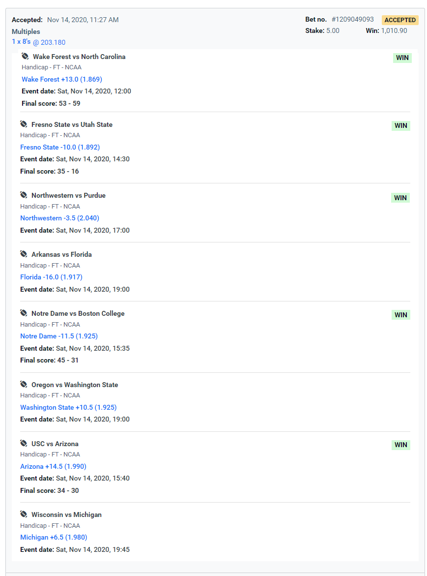 Won all my bets today as long as nothing weird happens at the end of this Notre Dame game:whew: Placing a bet on Tampa Bay -6 for tomorrow and withdrawing the rest.
