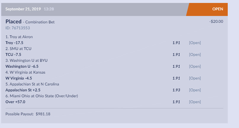 phillycavsfan WAHOOWA Supporter Joined May 6, 2012 Messages 24,656 Reputation 1,954 Daps 49,984 Reppin Philadelphia Sep 21, 2019 #1,116 Stanford +11 OK State +7 OK State/Texas Under 72 Georgia -14.5 Rice +27 SDSU +4 SDSU ML (To finish the underdog ML parley) Last edited: Sep 21, 2019