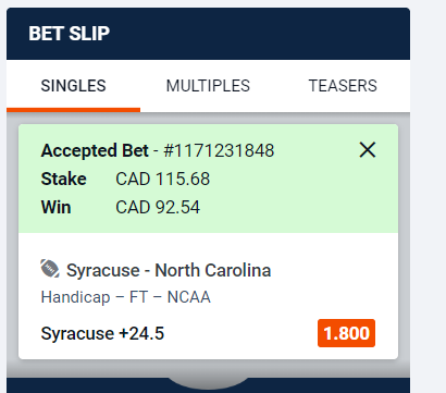 On this super teaser card Syracuse getting +34..Might pair that with 6 other teams on the super teaser card & put 20 dollars down to win 100I actually bet UNC -22.5. I think that the UNC offense is gonna put up a boatload of points.