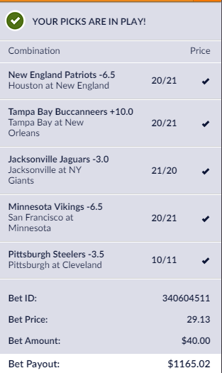 3 teamer. Also bet big on the under for BUF/BAL and a little bit on the Browns ML on a hunch.