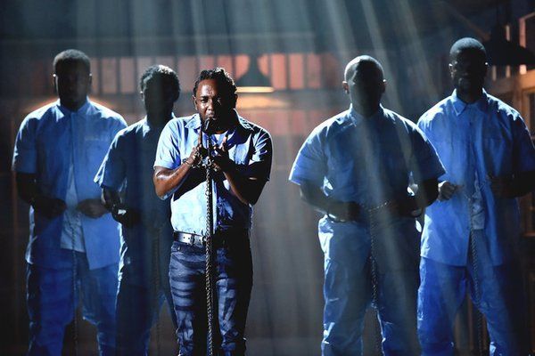 Lamar’s set was a fearless declaration of black pride and celebration of his Compton, Calif., hometown, Africa and the musical influences that helped mold his Best Rap Album-winning To Pimp A Butterfly. Lamar marched onstage in a prison jumpsuit, while shackled to a group of men also dressed as inmates. As his band played inside a makeshift prison cell, Lamar delivered a passionate performance of “The Blacker The Berry” before transitioning to "Alright."