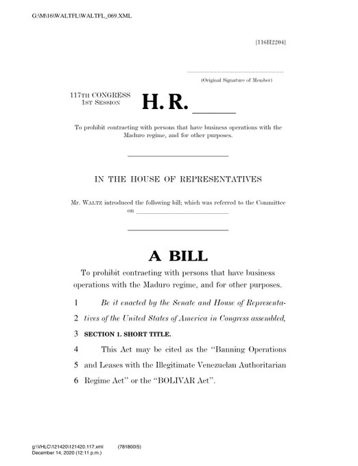 Today, Congressman Waltz introduced the bipartisan Banning Operations and Leases with Illegitimate Authoritarian Regime Act, or the BOLIVAR Act, that will prohibit government contracting with persons that have business operations with the Maduro regime.