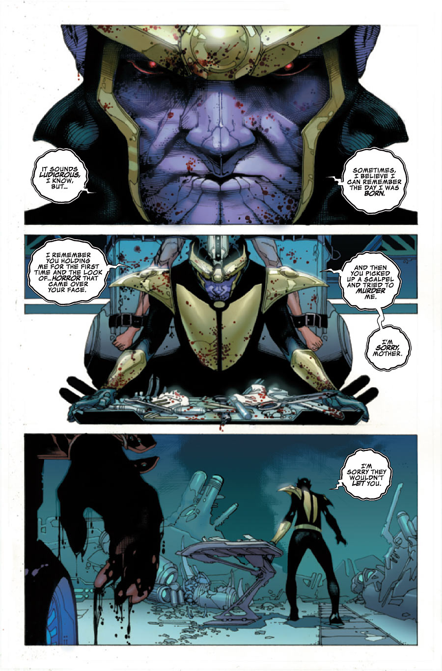Honestly, I prefer Aaron's rendition ofThanos to any other. We've seen the power mad schemer, we've seen the opportunist and the purveyor of mass genocide. What we never see is the lost, lonely child searching for someone to love and love him.Thanos' nihilistic introspection at times of boredom and his quick wit while in situations of danger color the character perfectly. When we meet the nameless woman on his home planet of Titan, we can see very clearly, who she really is and just how crazy in love Thanos is. Aaron does a good job of explaining; even in the comic book work, love makes you do things-- crazy, violent, psychotic things.