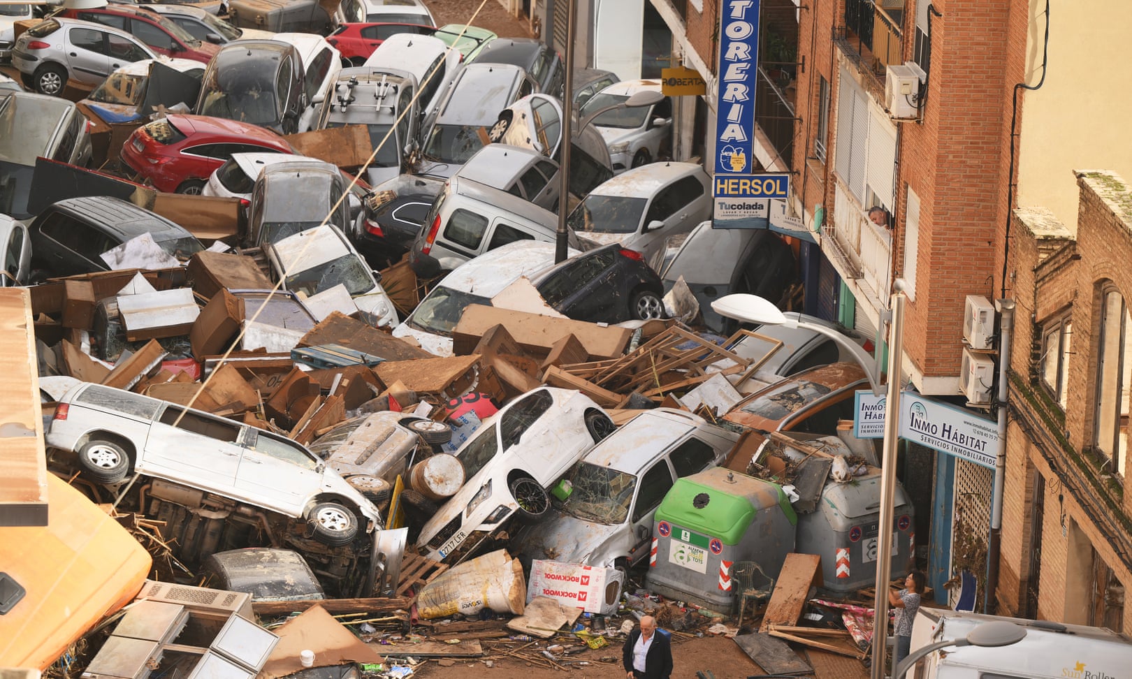 Cars piled up in the street after the ‘rain bomb’ that hit Valencia at the end of last month. Photograph: David Ramos/Getty Images