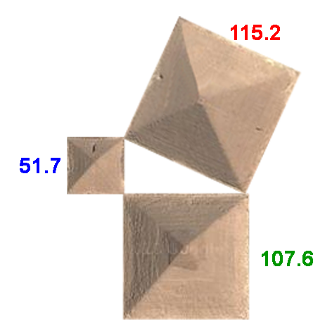 The base of Menkaure’s Pyramid is 51.7 cubits, the base of Khafre’s pyramid is 107.6 cubits, and the base of Khufu’s pyramids is 115.2 cubits. Plugging into the equation, we see that the mathematical result (119.4) is a statistically significant reasonable approximation, a difference of 4.2 cubits, less than 4% error (3.5%). Considering that the outer casing of the Giza pyramids have been removed, and the wear and tear on the pyramids over the thousands of years, this may account for the discrepancy.