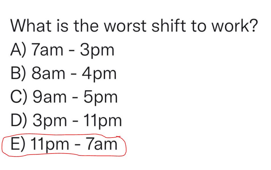 I don't work but if I did, D and E would be the worst. Those overnight shifts must be WOAT on your days off as your sleep cycle is probably all messed up. When does someone who works the 3-11 shift even eat dinner? :dahell: