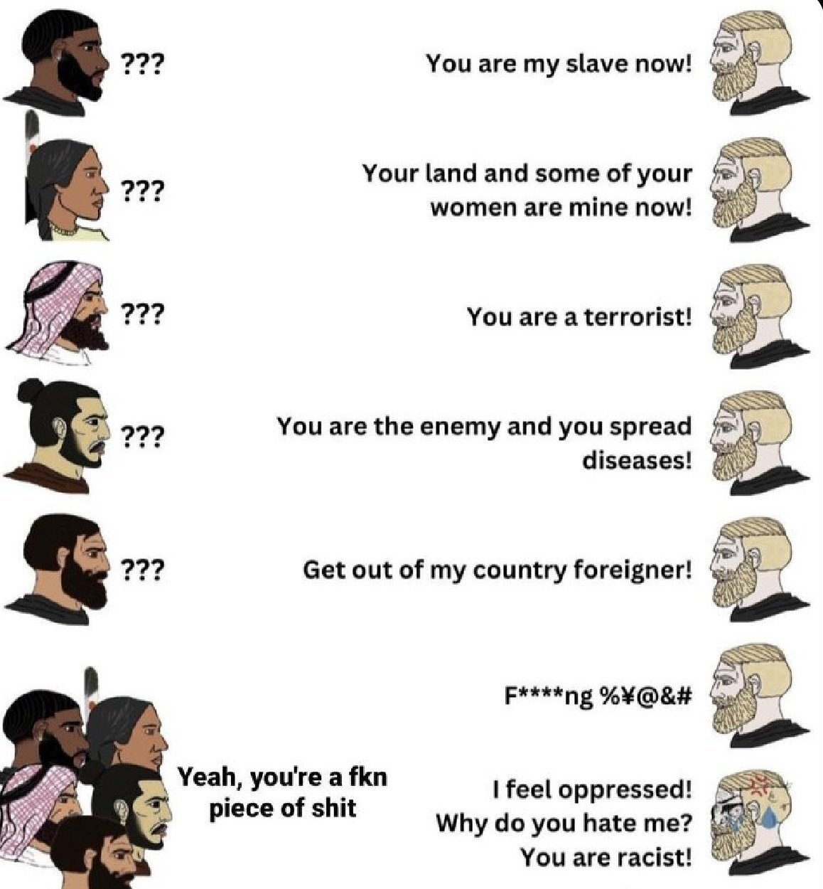 Or how they are the main ones living in lands belonging to non-white groups, but use their media to sell themselves as the worst victims of forced diversity, as if they were/are nothing more than a peaceful group that has always been in their own native lands, not bothering anyone, and that suddenly out of nowhere has been forced to accept diversity. When in reality, it's the complete opposite of their lunacy. They are the ones who forced diversity to every other group on earth. Diversity only went after them after they forced it onto non-whites. We must tell them.